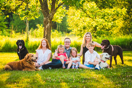 their sons, Nixon, Oliver, and George, and their dogs Miss Foxy